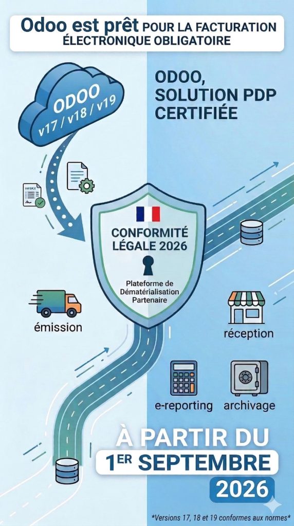 Dès le 1er septembre 2026, la gestion de nos factures franchit une étape historique. Pour accompagner la transformation numérique des entreprises françaises et simplifier les relations avec l’administration fiscale, la facturation électronique devient obligatoire. Bonne nouvelle : nous avons anticipé ce changement ! Nous vous confirmons que notre ERP Odoo a été officiellement retenu comme […]